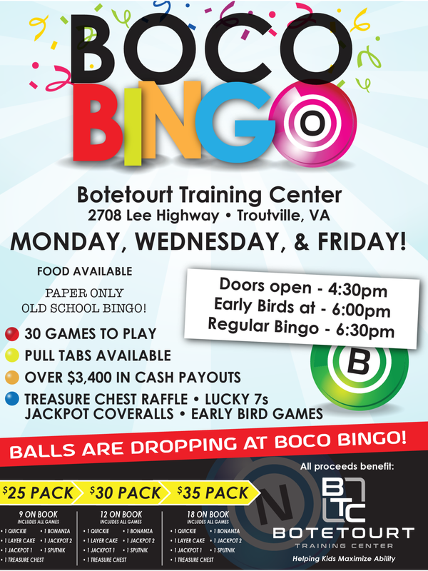 Bingo is a family fun environment to be in. Kids 10 years and up can play. Must buy seperate bingo pack and be accompanied by an adult. Players playing at a bingo session are assisting the Botetourt Training Center's charity mission. Putting money to good use for charitable and community needs for kids. See our information flyer below!! Thanks for stopping by. Want to volunteer for a good cause? See below.